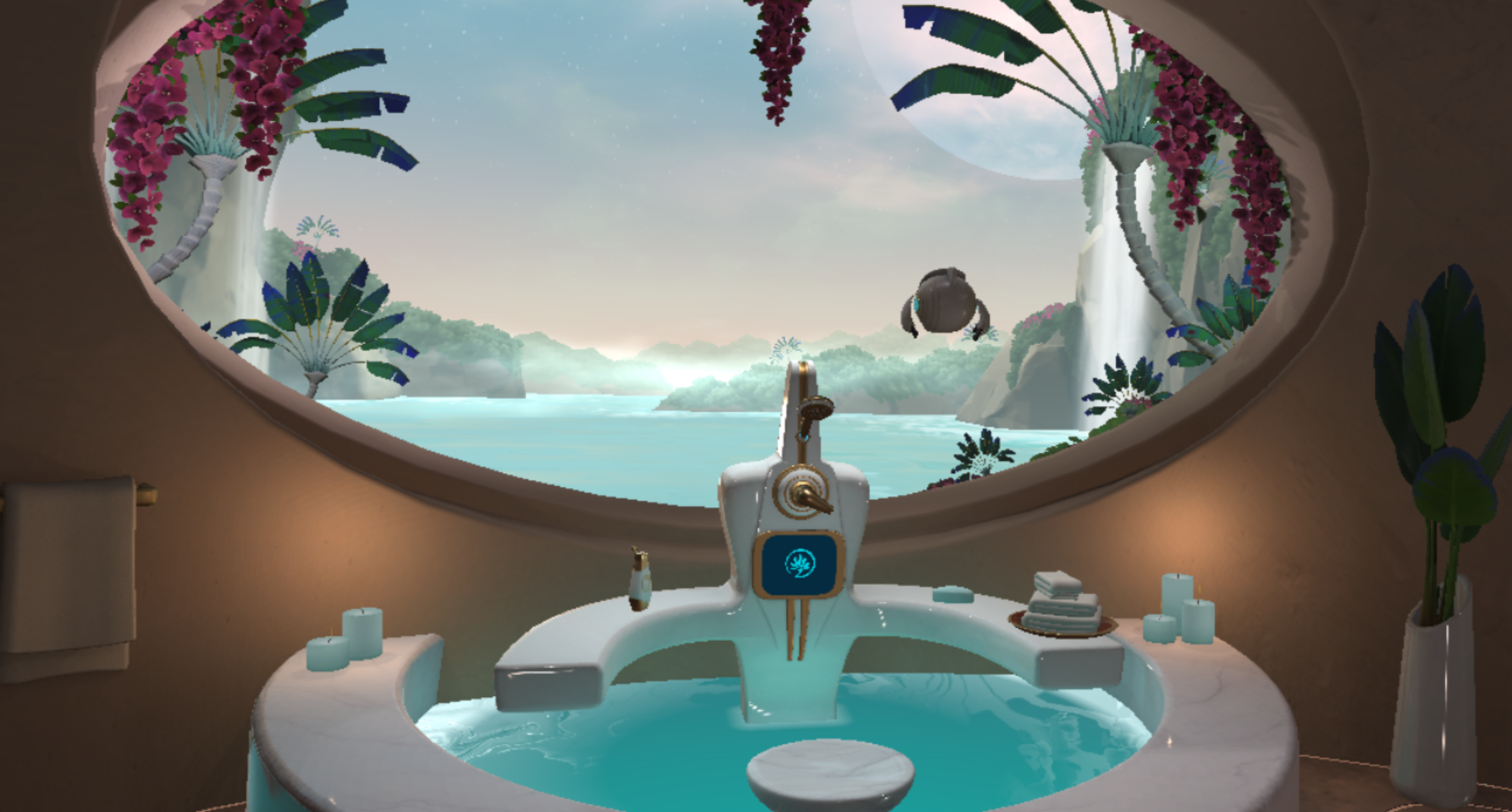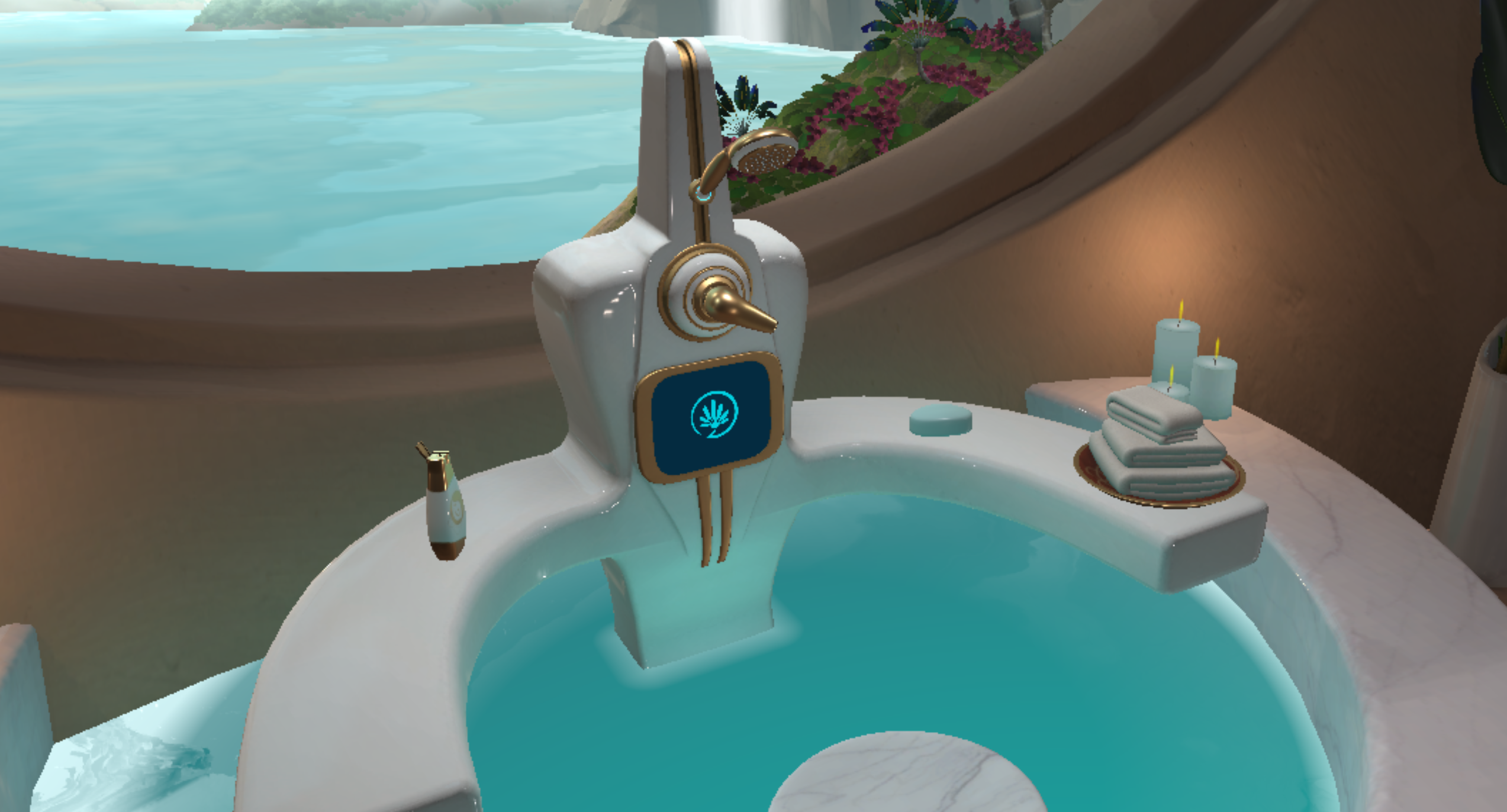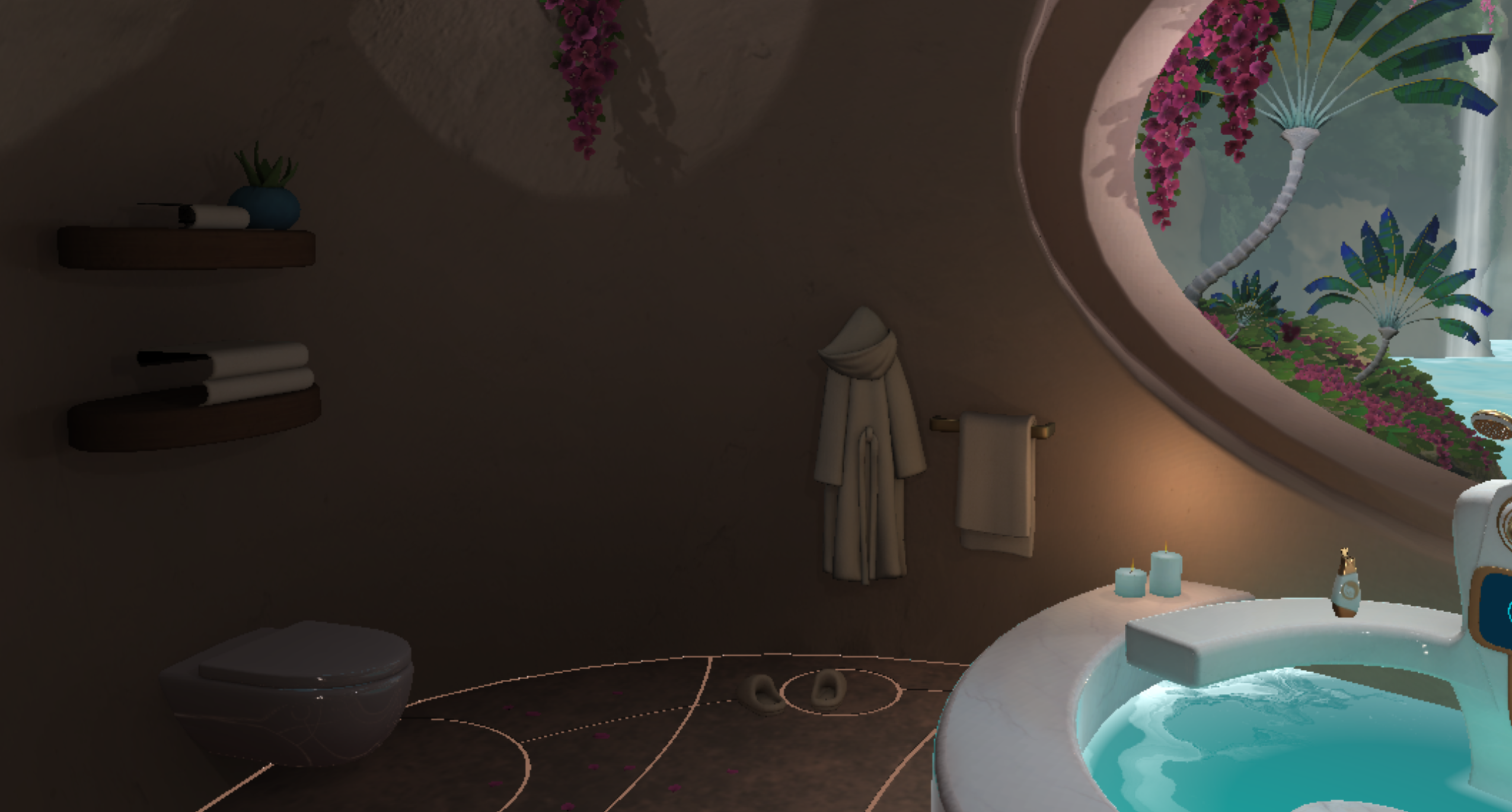 Activities of Daily Living, or ADL for short, are crucial in a patient’s rehab to return to their lives after injury. Our first ADL activity was bathing. We wanted a suite of ADL activities that included toileting, brushing teeth, and getting dressed. We tackled Bathing first and wanted a resort-like spa to host the activities in. The resort is futuristic and located on another planet to add interest to the mundane task of bathroom activities.