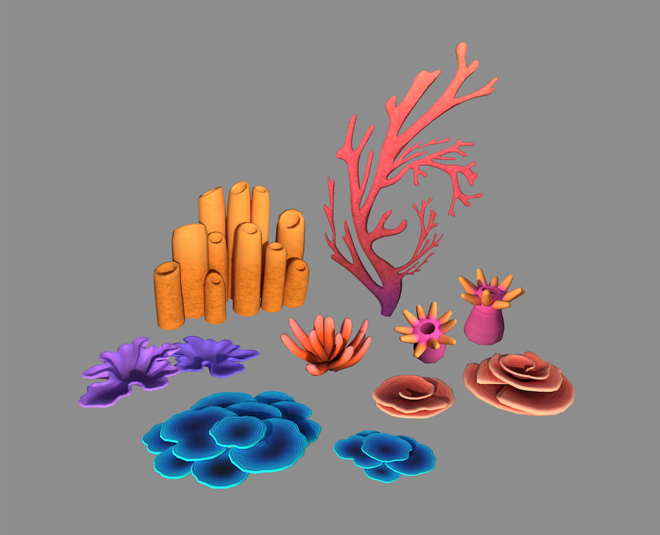 Coral assets. A special shader was made to change colors during gameplay that I helped work on with a tech artist.